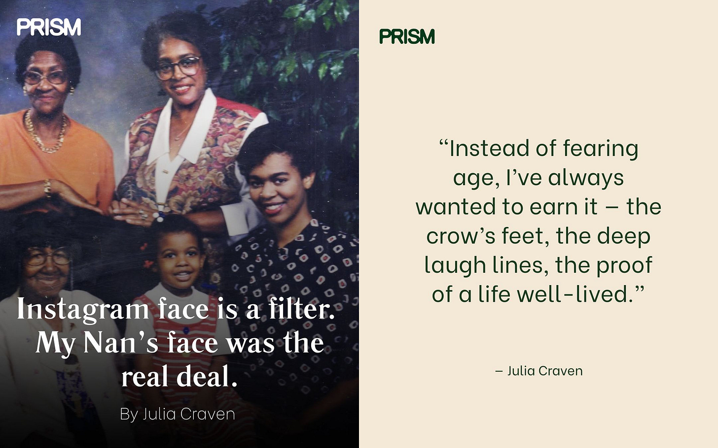 I’m not worried about how I’ll look when I’m older. I grew up surrounded by four generations of women whose beauty only got better with age — faces etched by laughter and late nights, not botox and fillers. Their lines told stories. Their loosened skin carried decades of living. They’d been here a while, and it showed in the best way. There was my great-great-grandma Vinnie; my great-grandmother, nicknamed Muss; my Nana; my Mama; and me.