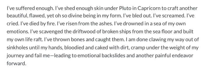 I must admit there are days when I want to dwell on my shit. I want to rot into the ground alongside it. Dwelling is more manageable than taking up the work of being well—setting actual boundaries, loving who looks back at me in the mirror even if I don’t always like her, blocking phone numbers, ignoring emails, saying no. It’s easier than drilling through the hardened layers of my psyche, examining the cracks, discarding that broken stone, and fertilizing, instead of salting, my earth, preparing it for something new, something more robust, something better—something I ultimately will need to build upon, fortify, and protect for as long as I inhabit this plane even when I cannot conceptualize what it is I’m creating. Healing is backbreaking work. It is not passive; it can’t be.