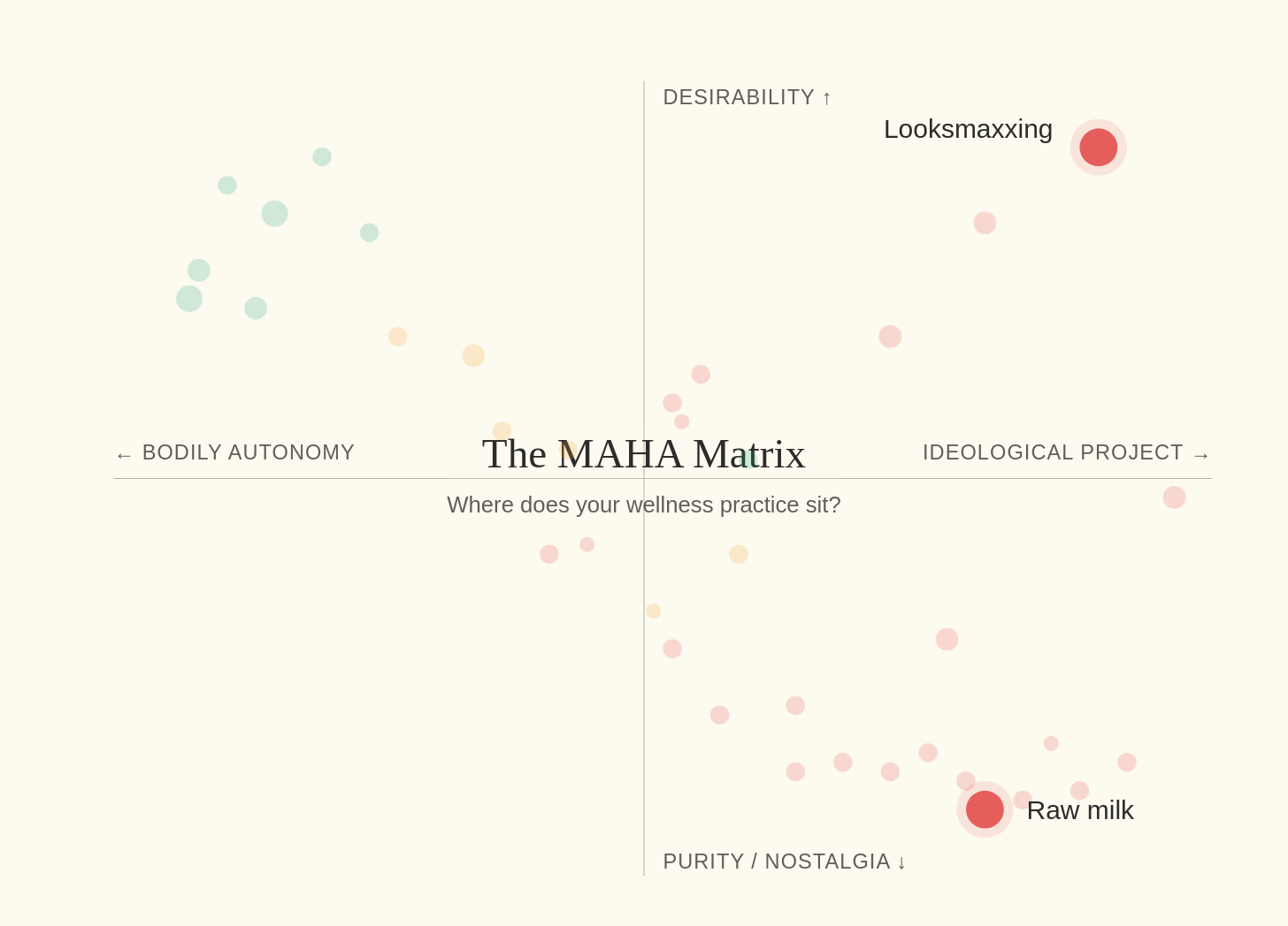 The X-axis runs from bodily autonomy to ideological project. The former refers to “decisions about your own body,” such as getting a gym membership, getting lip filler, and weight training. On the right, you have things like MAHA policy, looksmaxxing, the anti-vax movement, and the manosphere—ideological projects that require you to adopt a worldview to participate. These go beyond buying a product or service; you’re being recruited into a belief system that has a specific political valence.
